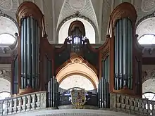 The organ was built by the company Steinmeyer (Oettingen) in 1956 and is a musical keyboard instrument with 34 organ stops (3 transmissions in the pedal) and an electro-pneumatic tracker (Taschenladen). At the balustrade is the Rückpositiv located that carries ornaments with the seal of Charles Philip III .