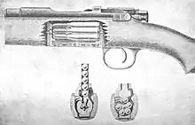 The rifle action was designed by Ferdinand Mannlicher and the rotary magazine by his protégé Otto Schönauer of the Österreichische Waffenfabriksgesellschaft (Austrian Arms-Manufacturing Company; now Steyr Mannlicher). The latter first patented a spool magazine in 1886[1] and a second design, shown on the sketch, was patented in 1900 together with Mannlicher.[2] While the more famous Mannlicher M1895 used the less common straight-pull bolt, the Mannlicher–Schönauer had a conventional turn-bolt, derived from the Gewehr 88 (and reminiscent of other typical military bolt-action rifles of the time). The Mannlicher–Schönauer may be identified by the split in the rear of the receiver which allows the bolt handle to pass through and doubles as an emergency locking lug when closed, in case of a failure to the primary locking lugs. The characteristic that sets the design apart from earlier members of the family is the Schönauer's rotating spool magazine.
