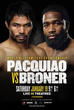 Manny Pacquiao vs. Adrien Broner, was a boxing match for the WBA (Regular) welterweight championship. The event took place on January 19, 2019 at the MGM Grand Garden Arena in Las Vegas, Nevada.[1][2] Pacquiao won the fight by unanimous decision and retained his WBA (Regular) welterweight title.[3] The bout sold 400,000 pay-per-view (PPV) buys in the United States, earned an estimated $30 million in pay-per-view revenue.[4][5] The bout also produced a live gate of $6 million from 11,410 tickets sold[6] and the final attendance was reported to be 13,025.[7]