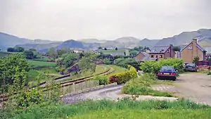 The 1 ft 11+12 in (597 mm) narrow gauge Festiniog and Blaenau Railway (F&BR) opened Tyddyngwyn station on 29 May 1868 to serve the then small community of Manod.[8] That station was named after a house nearby. The F&BR's primary traffic was passengers, and workmen in particular, with goods traffic small by comparison. Receipts in 1879, for example, included £1409 from passengers against £416 for goods.[9] Some slate was loaded at Festiniog, but the biggest single source was Craig Ddu Quarry which built a striking four-pitch incline to meet the F&BR near its Tan-y-Manod station, half a mile north of Tyddyngwyn station.[10]
