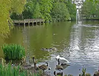 ![]() The ornamental pond, island and viewing platform in Manor House Gardens, Lee | |