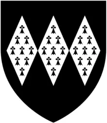 Sir John Cary (died 1395), who purchased the manor of Clovelly, but probably never lived there and certainly died in exile in Ireland. He was a judge who rose to the position of Chief Baron of the Exchequer (1386-8) and served twice as Member of Parliament for Devon, on both occasions together with his brother Sir William Cary, in 1363/4 and 1368/9.[19] He was a son of Sir John Cary, Knight, by his second wife Jane de Brian, a daughter and co-heiress of Sir Guy de Brian[20] (died 1349) (alias de Brienne), of Walwyn's Castle in Pembrokeshire and Torr Bryan, on the south coast of Devon, and sister of Guy de Bryan, 1st Baron Bryan, KG (died 1390). He married Margaret Holleway, daughter and heiress of Robert Holleway.