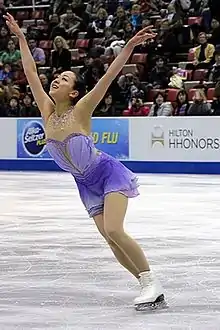 She is the former world record holder for the ladies' short program score, which she set at the 2014 World Championships and held until it was broken by Evgenia Medvedeva in 2016.[2] A former prodigy, Asada is the fifth woman and the first junior girl to land the triple Axel, accomplishing this at the 2004–05 Junior Grand Prix Final. She won her first Grand Prix Final at the age of 15. Considered by many to be the best figure skater in the world at that time, Asada was 87 days too young to compete at the 2006 Winter Olympics. She is the first figure skater in a singles discipline from Asia to win multiple world championships. At the 2013 Skate America, she became the first singles skater, male or female, to win all seven of the current events on the Grand Prix series.[3] She holds 15 Grand Prix series titles, the second-highest total among ladies and the sixth-highest total among skaters of all four disciplines.