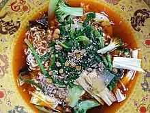 Maocai (Chinese: 冒菜; pinyin: màocài) is a stew-like dish originating from the Chinese city of Chengdu, in Sichuan. It is composed of a variety of vegetables as well as meat and/or fish in a stock made of mala sauce. Although it is similar to styles of hot pot common in this region, its chief difference lies in the fact that the ingredients are already cooked when served, and hence no simmering is done at the table.
