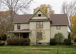 • The 1877 Frank Stewart house at 831 Dodge St is a 2-story Italianate frame house like many before, but large. The front porch's tapered posts are from the Craftsman style of the early 20th century.[11][2]