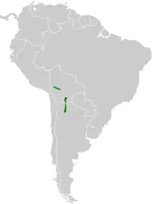 The maquis canastero is a bird of the east side of the Andes, though sources differ on the extent of its range. According to the International Ornithological Committee (IOC) and the Cornell Lab of Ornithology, it is present in Bolivia and Argentina.[3][2] It has an apparently disjunct distribution and it may also be present between the two known populations. One population is found in the northern Bolivian departments of La Paz and Cochabamba. The other is found in the northwestern Argentinian provinces of Jujuy, Salta, and Tucumán. There are sight records from the Bolivian departments between the two areas.[2] In contrast, the Clements taxonomy lists only the northern Bolivian range.[5]