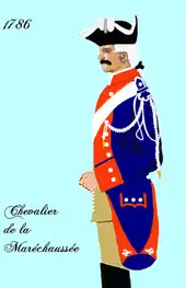 Le Blanc appointed two paymasters in the Maréchaussée in February 1719 to buy back command positions that had been sold or inherited and abolished the old companies and titles in favor of a more structured and hierarchical system.[46] The Maréchaussée was symbolically placed under the administrative authority of the marshals and the elite Gendarmerie de la Maison du Roi,[45] a heavy cavalry corps integrated into the household of the king and later dissolved on 1 April 1788. However, it was in practice answerable to Le Blanc's office.[45][44]
