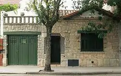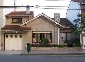 The style is also often associated in Argentina with the californiano ("Californian"), another vernacular type of house close connected with the American Mission Revival style.[3] Mar del Plata style's features, however, are more related to the older Mar del Plata's picturesque architecture, an eclectic style already popular among the upper-class people who used to spend summertime in this resort city between 1885 and 1945,[4] and to the American Craftsman style.[5] The precursor of the style was the Italian-born architectural engineer Alula Baldassarini, who popularized the use of stone on the frontispieces in 1925.[5] Some of these early examples were labeled chalet inglés ("English chalet"), a type of bungalow or cottage which flourished between 1925 and 1935.[6] Baldassarini also developed a cladding technique known as bastón roto ("'broken stick"), which consisted in rectangular stone bricks irregularly arranged on vertical and horizontal joints.[7]