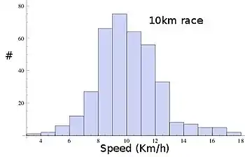 Histogram of the speeds in the 10 km race in Marabana 2012. Computed out of the official speeds reports.