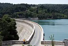 The foundation stone for the dam was laid in October 1926 by Prime Minister Alexandros Zaimis; Venizelos was also present at the ceremony.[1] With 450 workers, construction continued on the dam and water network for three years and in 1929, the reservoir began to fill. Work on the dam and water network was complete in May 1931.[1][3] A year after inauguration, the 13.4 km (8 mi) Boyati Tunnel was transferring 500 litres (130 US gal) per second of water treated at the Galatsi Water Treatment Plant to Athens.[1] The dam would serve as the primary water supply for Athens until 1959, when water was pumped from Yliki lake.[3]
