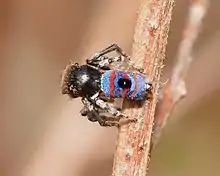 - ↑ Hill, D.E. (2009) Euophryine jumping spiders that extend their third legs during courtship (Araneae: Salticidae: Euophryinae: Maratus, Saitis). Peckhamia 74.1:1-27. Retrieved 6 August 2019.
