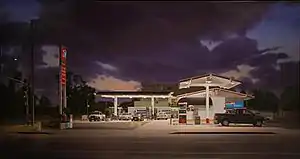 His paintings depict places common to North American urban and suburban landscapes such as big chain and warehouse stores, gas stations, shopping malls, and chain restaurants.[1]