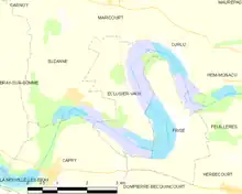 Near Éclusier, the Somme River forms a lake surrounded by bogs and marshy footpaths that were difficult for soldiers to follow[4] so Semmer took on the task of guiding troops as they maneuvered through the wetlands.[5] While escorting a squad of French soldiers to an advanced position, they were all captured by German troops near the village of Frise. The commander there (some sources[5] say it was the same man as before) locked Semmer in the village church. She was certain that the firing squad would be called the following day, but again the French artillery saved her by shelling the village and opening a large hole in one wall of her enclosure. According to Hart, "Creeping past the Germans scattered through Frise, she soon tumbled safe and sound into the nearest French trench."[2]