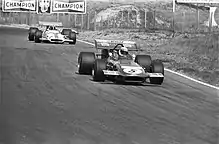 Although designed and built in only 12 weeks, no fewer than five March 701 cars were present at the first race of the 1970 World Championship season: the 1970 South African Grand Prix in early March.[3] The two March Engineering-entered works cars were chassis 701/1 (in red) and 701/5 (in a brighter, 'dayglow' STP red)[17] for Chris Amon and Jo Siffert, respectively. Amon had joined March as the works' lead driver from Scuderia Ferrari, while Siffert's drive had been bought for him by Porsche for £30,000, in order to keep him from signing as Amon's replacement with the Italian team.[3] A third 701 present also wore the darker of the two red STP liveries. This car, chassis 701/3 but presented as the "STP Oil Treatment Special", was owned and entered by Andy Granatelli to be driven by Mario Andretti. Both Tyrrell cars – chassis 701/2 and 701/4, in Tyrrell's Elf-sponsored blue livery – were also present, driven by reigning World Champion Jackie Stewart and Tyrrell's number two driver, Johnny Servoz-Gavin.[20]