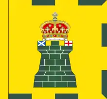 The badge of office is A tower of three castellations Vert masoned Argent, the dexter castellation Azure charged of a saltire Argent the sinister castellation Argent charged of a cross Gules, all ensigned of the Crown of Scotland Proper..[3]