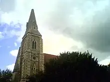 Marchwood was at one time in the parish of Eling, and is situated in that part of the ancient parish which lies low at the mouth of the River Test, southeast of Eling village.[6] Cracknore, in Marchwood, was the landing place of the ferry from Southampton long before the Hythe Ferry.[3] There was an important beacon site here at Beacon Hill, receiving and sending messages to both ends of the Isle of Wight.[3] Marchwood became a separate ecclesiastical parish in 1843, and a civil parish in 1894.[6] The church was built and endowed by Horatio Francis Kingsford Holloway in 1843.[6] By the beginning of the 20th century, there were Government gunpowder magazines and a Metropolitan Police barracks in Marchwood.[6]