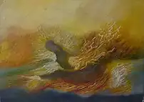The Tonaltimbrica was presented as "a two-dimensional painting in a single figurative system."[15] Stylistically, it is characterized by the extreme reduction of its two constituent elements: on one hand, the "tonal" element that outlines the masses in the background of the painting using a color base that defines spaces through variations in tone within a uniform chromatic range; on the other hand, the "timbric" sign, consisting of the relief texture of pure color that structures the tonal masses in the background of the picture.[16][17] It is through the interaction of these two distinct components (tonal+timbric) that a representation is achieved that is "rough and poignant," "able to make one feel the struggle and drama that continuously unfold at every level of life."[13]