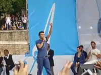 On 21 February 2009, he won the 59th Sanremo Festival in the category Artists with the song "La forza mia" written by Paolo Carta, the producer, songwriter and guitarist of Laura Pausini, winning 57.62% of the preference votes of the public[13][14] On 20 February, he published and released his third album, La forza mia. Just four days after release, La forza mia wins platinum status with over 80 thousand copies sold.[15] and debuted in third place in FIMI.[16] Two weeks after release, the album moves from third to second position in the leader FIMI.[16] His second single, "Dentro ad ogni brivido", was released in April 2009. On 16 May, Carta won the awards Man of the Year and Best No. 1 of the year, in TRL Awards 2009.[17][18] The "Marco Carta Tour 2009", which started on 30 April, had a great success with the public, to the point that some dates were canceled for being overcrowded.[19] That same year, Carta wins two Wind Music Award for discs of platinum albums achieved withTi rincontrerò and La forza mia, plus a special prize (RTL 102.5), the Sirmione Catullo 2009 prize as the revelation of the year, and then the Venice Music Awards 2009 as the best artist of the year. On 16 September, after 5 months, the summer tour ends and on 26 September, his song "Dentro ad ogni brivido" is voted as the most representative song of summer 2009 as the MTV Coca-Cola The Summer Song.