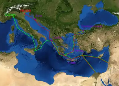 After the 11th century, Italian merchant cities, mainly the Republic of Venice and Republic of Genoa, developed their trade with the Orient, mostly Constantinople and Egypt, first stages of the silk road. Trade routes of both cities were almost identical. Venetian boats ran alongside the East coast of the Adriatic Sea with stops in Zara, Dyrrachium and Corfou, then around the Peloponnese with Koroni and up the Aegean and Cyclades with stops in Naxos, Euboea and Thessaloniki to Constantinople, or via Crete, Alexandria and Syria to Egypt. The Genoan ships ran alongside the West coast of Italy, crossed the Strait of Messina then the Strait of Otranto to Corfou, round the Peloponnese stopping at Monemvasia, up the Aegean and Cyclades with stops in Chios to Constantinople or via Milos, Naxos and Amorgos to Egypt and Syria.[17] Thus, the cities were competing to control the stopping places.