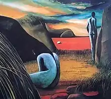The art critic Elvio Natali noted that the "one unfailing subject" which recurred throughout Lusini's work was "The human image, whether it is a woman's image or a man's image, often asexual, as a symbol of a common, undifferentiated destiny."[4] He nevertheless noted that Lusini's work went through several cycles, among them "Lovers", "Mysterious figures", "Homage to Brecht", "Object Woman", and "Oneiric Landscapes".[4]