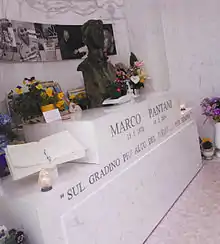 In the early evening of 14 February 2004, Pantani was found dead at a hotel in Rimini, Italy. An autopsy revealed he had cerebral edema and heart failure, and a coroner's inquest revealed acute cocaine poisoning. Pantani spent the last days of his life isolated from his friends and family and barricaded himself inside his hotel room.[72][73] Pantani's ex-girlfriend Christina Jonsson, in an April 2004 interview to Swiss news magazine L'Hebdo, indicated that following his expulsion from the 1999 Giro d'Italia, Pantani had confessed to her he had started using cocaine.[74] In 2008, Fabio Carlino was convicted of supplying Pantani with a dose of ultra-pure cocaine that caused his death. The conviction was overturned in 2011 by the Court of Cassation after the acting Prosecutor expressed doubts regarding the verdict, while stating that he "had the impression that the exaggerated media publicity surrounding Mr. Pantani's death led the judges to an excessive attribution of responsibility."[75] In 2016 the case was opened again,[76] but shelved, and then yet again; with Italian prosecutors citing about fifty pages of new evidence to consider, in November 2021.[77]