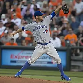 On November 1, 2014, Estrada was traded to the Toronto Blue Jays for Adam Lind.[5] He and the Blue Jays avoided salary arbitration when he agreed to a one-year, $3.9 million contract on January 16, 2015.[6] Estrada opened spring training in competition for the fifth starter role with Aaron Sanchez. He began the 2015 regular season in the bullpen, but was moved into the starting rotation after the Blue Jays optioned Daniel Norris to the Triple-A Buffalo Bisons on May 1.[7] On June 19, he took a no-hitter into the 8th inning against the Baltimore Orioles, which was broken up by a bloop single from Jimmy Paredes.[8] In his next start, he took a perfect game into the 8th, which ended when Logan Forsythe hit a weak infield single. Estrada became the first player to lose no-hit bids in the 8th inning or later in consecutive games since Dave Stieb did so in 1988.[9] Estrada continued his strong play to the end of the season, and had the best season of his career, finishing with a 13–8 record, 3.13 ERA, and 131 strikeouts in a career-high 181 innings pitched.[10] He led the major leagues in holding opposing batters to the lowest batting average on balls in play (.216).[11]