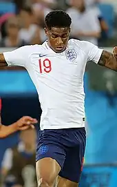 In 2015, United Under-19s manager Nicky Butt praised Rashford's performances for the team in a group stage match of the UEFA Youth League.[29] His inclusion in the team began following an injury to Demetri Mitchell, and he capitalised on his chance by scoring six goals in 11 games in the Under-18's Premier League, as well as three goals in the Youth League.[30] He was awarded the captaincy of the team by Butt, who hailed him as a leader.[31] Rashford was named on the first-team bench for the first time on 21 November by Louis van Gaal for a Premier League match against Watford, which Manchester United won 2–1.[32] He received the number 39 squad number, due to Van Gaal's insistence that strikers wear a squad number containing a nine.[33] The following week against Leicester City, he was again named on the bench, but was again unused in a 1–1 draw.[34] In February 2016, Rashford was subject to a loan bid from League One club Crewe Alexandra, but the temporary transfer was rejected by Reserves manager Warren Joyce.[35][36] Former teammate Sean Goss described how Rashford impressed in first-team training sessions while the club was suffering an injury crisis, despite being one of the younger players called up to train.[37]