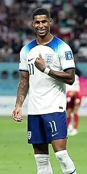 Despite not appearing for England since the final of the European Championships, Rashford was named in Southgate's 26-man squad for the 2022 FIFA World Cup in Qatar, and was again assigned the number 11 shirt.[229][230] In England's opening game of the group stage, a 6–2 win over Iran, Rashford came on as a second-half substitute and scored within a minute of coming on, making the score 5–1.[231] At 49 seconds, the goal was the third quickest by a substitute in World Cup history.[232] In England's final group game, Rashford scored two goals in a 3–0 win against Wales to qualify for the knockout stage.[233] His second was England's 100th goal in all World Cups,[234] and meant he became only the second United player after Bobby Charlton to score three or more at a major tournament.[235] Southgate and former England defender Gary Neville both praised him for making progress after a tough 18 months for both club and country.[236][237]
