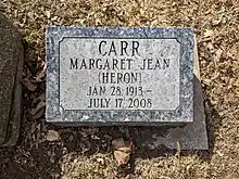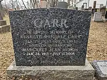 Carr passed away on Thursday, July 17, 2008, at the age of 95.[1] On Saturday, July 19, 2008, funeral services were held at Saint Andrew's Presbyterian Church in Scarborough in honorarium.[1] Carr is buried at Saint Andrew's Presbyterian Church Cemetery next to her husband.