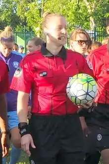 Domka was selected as a match official for the 2015 FIFA Women's World Cup.[1][2] She was previously a FIFA international assistant referee in 2007 and 2008, and worked the 2010 and 2014 FIFA U-20 Women's World Cups.[3] She also worked the 2012 Algarve Cup championship.[4] Domka was formerly an NCAA Division III All-American at University of Wisconsin–Stevens Point.[5]
