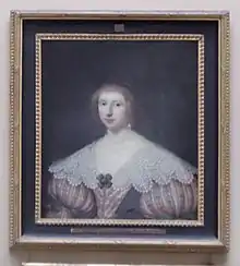 An inventory of luxury goods belonging to Margaret and the Earl of Nottingham written by the notary David Moysie in 1606 gives an idea of the material culture of Jacobean courtiers. There were a large number of buttons set with diamonds and rubies, a flask of amber for musk, two bezoar stones, a variety of silver plate including a lemon squeezer and dishes for sausages and eggs, a silver sugar box shaped like a scallop shell, and bed curtains of velvet and of "China stuff."[33] A portrait of the countess attributed to Paul van Somer places her in a rich interior with curtains dressed with bobbin lace and wearing needle lace collar and cuffs.[34]
