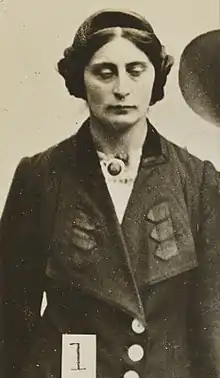 Schenke was afraid that she might be deported so she gave her name as Margaret Scott and under this name she was sentenced to a month's imprisonment in Holloway Prison. In an unusual twist she was secretly photographed and she was the first picture on the first of two sheets of photographs that were distributed to police and art galleries to warn them of militant suffragettes.[3] The pictures were taken from a concealed car during prisoners' exercise using an 11-inch powerful lens which had only recently been made in Britain. It was required because the suffragettes would distort their faces when conventional mug shots were being taken and the Home Office was worried by the impact of their arson and vandal attacks.[4]