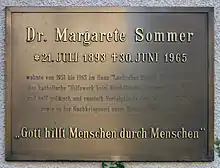 From 1939 she became increasingly active in the Welfare Office of the Berlin Diocesan Authority ("Hilfswerk"), and in 1941 she became managing director under the Cathedral Provost Bernhard Lichtenberg.[1] Lichtenberg was a noted anti-Nazi resistor, who was under the watch of the Gestapo for his courageous support of prisoners and Jews, and who was arrested in 1941 and died en route to Dachau in 1943.[5] After this, Sommer took operational charge of the agency, reporting to Bishop Konrad von Preysing.[1] Presying was one of the leading Catholic voices against Nazism in Germany.[6] Her employees called her "the Sommerin".