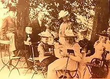 ![]() Margarethe, front, looking into the camera with the von Reinken family, circa 1890 | |