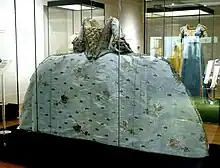 Tullie House Museum and Art Gallery holds a blue silk court mantua once owned by Jackson. The dress was made between 1750 and the early 1760s. Jackson would have been about 27 years old in 1750, but she was single, and such a dress was made for the use of a married woman at the royal court. The early provenance of the dress is unknown.[3][22] The skirt is 2.4 metres (7.9 ft) wide.[23] The mantua has been dated according to the shape of its hooped petticoat, which is fan-shaped in this case, but would have been more rectangular in the 1740s or late 1760s. The dress is in "pristine condition", and it retains its original stomacher and "hugely expensive" silver lace.[22] As of 2021 it was displayed in the new costume galleries at Tullie House.[24]
