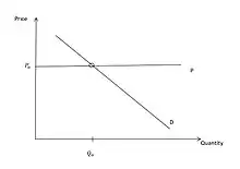 This is the case as a company will only produce whilst the price is greater or equal to the marginal cost, given by the supply curve, and the consumer will only buy the good if the demand at that quantity is greater than the cost.[8] The intersection point is consequently equilibrium as it is the price and quantity where a goods supply would equal its demand.[6] Any natural deviation from this equilibrium would be naturally resolved within a competitive environment and return to this state.