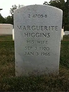- ↑ Burial Detail: Hall, Marguerite H – ANC Explorer, with gravestone reading "Marguerite Higgins" 2 4705-B