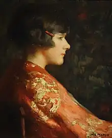 Pearson was known for traditional paintings of women seated in warm domestic scenes, at a piano, knitting, or reading, for example. She also painted some nudes, still lifes, and landscapes. Her models were sometimes dressed in older period fashions and surrounded by historical furnishings.[4] An early show of hers, at the Somerville Public Library in 1924, was greeted with appreciation for both her works and her "battle against great odds".[5] She became a member of the Guild of Boston Artists in 1930, and had regular shows under their auspices into the 1950s.[6][7] An approving reviewer for The Boston Globe commented that "She doesn't distort the faces or figures in her portraits... she doesn't upset the laws of gravity in her landscapes. She sees straight and she paints straight."[8] A later show at the Guild, in 1947, impressed another reviewer with the "compelling calm" and "perceptive tenderness" of Pearson's portraits.[9]