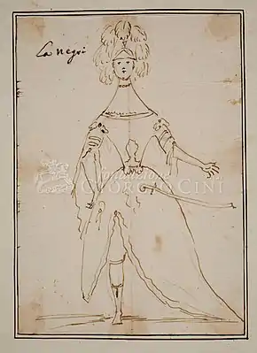 Negri returned to Italy in 1727 where she sang with Vivaldi's company at the Teatro Sant'Angelo in Venice for two seasons. According to Vivaldi's biographer Egidio Pozzi, Negri was known for her fiery temperament both on and off stage. The previous year in Prague her furious dispute with the impresario of Sporck's theatre ended in the police arriving at her house threatening her with arrest for breach of contract.[2] In Venice Vivaldi cast her as the tyrant king Arsace in Rosilena ed Oronta and the female warrior Bradamante in Orlando furioso, a character she would reprise in Handel's Alcina six years later. Appearances in other Italian cities followed over the next five years as well as an appearance in Frankfurt in 1732 when she sang in the premiere of Giuseppe Maria Nelvi's Siface re di Numidia.[1][3]