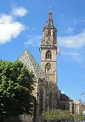 The first priest of Bozen, Rudolf is mention in 1195 on the occasion of a land exchange between the Upper Bavarian imperial abbey at Tegernsee and the Prince-Bishopric of Trent. Due to sparse sources from this time, it is unknown when the church was elevated to a parish church.[3] In 1259, Count Meinhard II acquired the lands of the parish and from this time, the parish church functioned as cella memoriae for the Tyrolean regents of the House of Gorizia and after 1363 for the Habsburgs.[3] This anniversary of the bequeathment of the Tyrolean assets to the Habsburgs (der jarttæg … der herschafft von Ósterreich) was confirmed by a settlement in 1435, in which the entire German part of the Prince-Bishopric of Trent committed to the octave of Maria Himmelfahrt.[4]