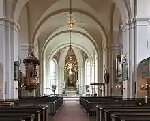 Both Nicodemus Tessin the Elder and the Younger gave the church its Baroque appearance. The spire of the former, however, inaugurated in 1676 and according to himself the most beautiful spire in Stockholm, was destroyed in a fire in 1759 together with some 300 buildings in the neighbourhood. Superintendent Carl Johan Cronstedt was commissioned to rebuild the church and had his task completed in 1763. He humbly respected both his older colleagues and preserved much of their design, and the church is still largely intact since.[1] Johan Hafwersatt and Christian von Thum painted the decorative elements at the Church in 1683-1684.[2]