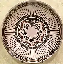 Maria Poveka Montoya Martinez (c. 1887 – July 20, 1980) was a Native American artist who created internationally known pottery.[1][2] Martinez (born Maria Poveka Montoya), her husband Julian, and other family members, including her son Popovi Da, examined traditional Pueblo pottery styles and techniques to create pieces which reflect the Pueblo people's legacy of fine artwork and crafts. The works of Maria Martinez, and especially her black ware pottery, survive in many museums, including the Smithsonian, the Metropolitan Museum of Art, the Denver Art Museum, and more. The Penn Museum in Philadelphia holds eight vessels – three plates and five jars – signed either "Marie" or "Marie & Julian".[3]