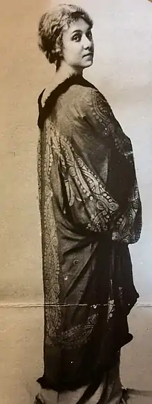 Gallenga started designing and making textiles and clothing in 1914 out of a studio in Florence.[3] She often exhibited her designs in art exhibitions.[3] These designs combined a unique mixture of old world motifs, such as heavy velvet and medieval patterns, with more modern 1920s silhouettes.[4] Gallenga also had a flair for theatricality and designed many cloaks and capes.[3] In 1923, Gallenga was awarded a Silver Medal at the Monza design exhibition.[3] In 1928, Gallenga co-founded the Boutique Italienne in Paris with the designers Bice Pittoni and Carla Visconti di Modrone.[3]