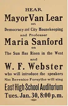 Maria Sanford and Mayor Thomas Van Lear speak on good government and women's suffrage in Minneapolis in 1917