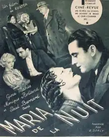 Maria of the Night (French: Maria de la Nuit) is a 1936 French drama film directed by Willy Rozier and starring Gina Manès, Paul Bernard and Monique Rolland.[1] [2] The film's sets were designed by the art director Robert-Jules Garnier.