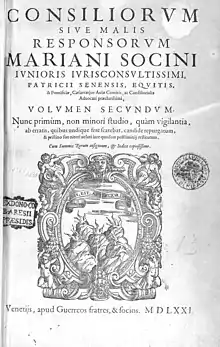 - Consilia (Consiliorum siue malis Responsorum Mariani Socini iunioris iurisconsultissimi, patricii, Senensis, equitis, & Pontificiæ, Cæsareæque Aulæ Comitis, ac Consistorialis Aduocati præclarissimi) (in Latin). Vol. 1. Venice. 1571.