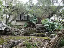 By 1938 Byles left her family home in Beecroft and built her own house on bushland that she had bought in 1935 at the edge of nearby Cheltenham, adjacent to crown land.[17] She named it 'Ahimsa' after the term used by Gandhi meaning "harmlessness". The four-room simple cottage is built of fibro and sandstone, and the large north-facing verandah is primarily where Byles slept and lived in preference to the interior rooms. In addition to the house, she wanted to have a place on her land for groups to meet for discussions and meditation. By 1949, the 'Hut of Happy Omen' was complete, designed as an open sleepout with bunks and a large sandstone fireplace. She had another small house built next to 'Ahimsa' in 1975, called 'Sentosa' (a Malay language word meaning peace and tranquility).