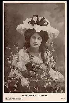 Dainton made her first London appearance at the Metropolitan music hall in Edgware Road on 6 August 1894. On 24 December 1894 she opened as 'Mr Falsehood' in The House that Jack Built at the Opera Comique, and the following year toured as Flo in Buttercup and Daisy. The next few years were spent appearing mainly in the music halls until June 1899 when she scored a big success at the Avenue Theatre giving impressions of popular stage stars in a production titled Pot Pourri.[2] In 1898 Dainton appeared in the pantomime Puss in Boots with Eugene Stratton at the Prince of Wales Theatre in Birmingham.[3] She also appeared in the legitimate theatre. Dainton was in demand both in London and on tour in the British provinces and abroad. During 1900 and 1901 she appeared at the Casino Theatre in New York, and at the Apollo Theatre in London, as Paquita in The Belle of Bohemia. In New York, she temporarily was restrained from appearing in the show until a breach of contract case was resolved in the courts.[4] She also toured Austria as Fifi in The Belle of New York. At the Strand Theatre in London in 1902, she appeared in the successful musical play A Chinese Honeymoon. In 1902, she made several gramophone recordings for the Gramophone & Typewriter Co Ltd and Pathé of songs from this show, namely "The à la Girl", "Sweet Little Sing-Sing", and "Mandie of Ohio".[1]
