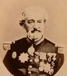 Dupré was promoted to commander in 1854. He fought in the Crimean War, then served in the expeditions to Syria and Saigon.[3] In 1861 Dupré concluded a commercial treaty with Radama II, King of Madagascar. He was Governor of Réunion from 1864 to 1869.[1] As governor of Réunion he was always helpful to scientific researchers, and in return the Madagascan fruit bat (Eidolon dupreanum) was named in his honour.[4] In 1867 he was promoted to rear admiral. In 1870 Dupré participated in the French blockade of Chinese and Japanese ports.[3] The French were trying to keep these ports closed to the Germans.[5] Dupré was present at the Tianjin Massacre.[3]