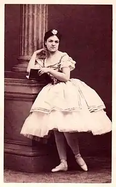 Marie's connection with artists was long and sustained. She was the mistress of the American painter Julius LeBlanc Stewart and later of Count Ludovic-Napoléon Lepic, for whom she cared in his final illness. The latter was an artist formerly on the fringes of Impressionism and a friend of Degas. Through Degas and his connection with the ballet, for which Lepic later designed costumes, he came to know Rosita Mauri and Marie, both of whom posed for him.[2] At one particular session in 1881 he was joined by Pierre-Georges Jeanniot and the Spanish painter Adolfo Guiard. While Mauri and Sanlaville sat for their heads, the two apprentices by whom they were accompanied modelled the ballet poses. One of the fruits of this sitting was the picture of Marie in the role of Fanella that was published in the magazine La Vie Moderne in February 1882.[3]